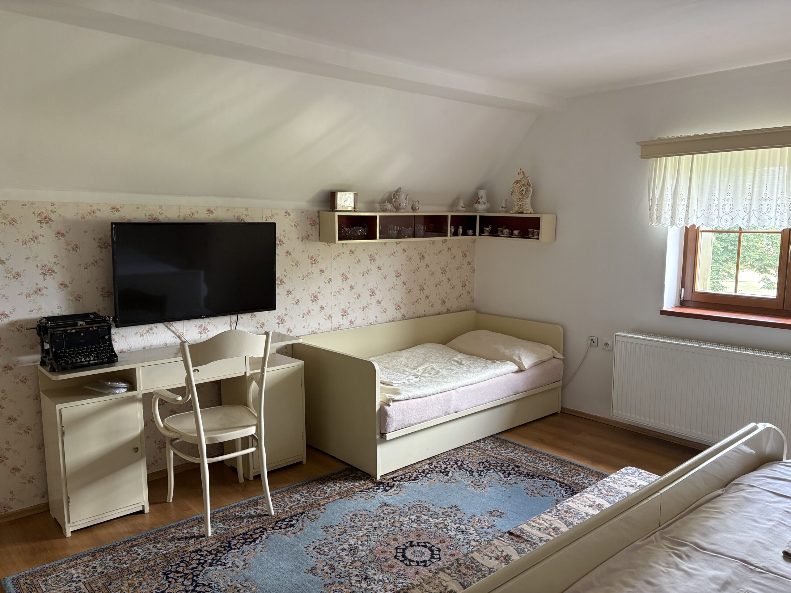Část s moderním a část s původním prvorepublikovým nábytkem